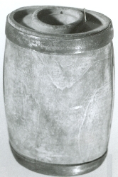 Manierka drewniana rosyjska. W kształcie walca o przekroju elipsy. Elementy drewniane spięte metalowymi obejmami o szerokości 1,5 cm w górnej i dolnej części. Wzdłuż manierki, na bocznych krawędziach znajdują się wąskie paski blachy o szerokości 6 mm łączące obejmy meta...więcej Manierka drewniana rosyjska. W kształcie walca o przekroju elipsy. Elementy drewniane spięte metalowymi obejmami o szerokości 1,5 cm w górnej i dolnej części. Wzdłuż manierki, na bocznych krawędziach znajdują się wąskie paski blachy o szerokości 6 mm łączące obejmy metalowe górną i dolną. W górnej części znajduje się centralnie umieszczony otwór o średnicy wewnętrznej 2,5 cm. Na denku wytłoczony nieczytelny napis w języku rosyjskim. Brak korka. |