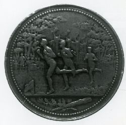 Awers: Na pierwszym planie sylwetki trzech biegaczy, w głębi trybuny z widzami otoczone drzewami. W dolnej części gałązka dębu i maczuga(?)
