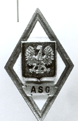 Odznaka pamiątkowa absolwenta Wojskowej Akademii Sztabu Generalnego. Do odznaki wykonanej z aluminium przylutowane jest godło państwowe PRL oraz wstęga z napisem ASG.Tło pod godłem emaliowane na biało.Całość obramowana tłoczoną ramka. Na odwrocie przylutowany trzpień z gwi...więcej Odznaka pamiątkowa absolwenta Wojskowej Akademii Sztabu Generalnego. Do odznaki wykonanej z aluminium przylutowane jest godło państwowe PRL oraz wstęga z napisem ASG.Tło pod godłem emaliowane na biało.Całość obramowana tłoczoną ramka. Na odwrocie przylutowany trzpień z gwintem do mocowania i zakrętka aluminiowa, oksydowana, z napisem Mennica Państwowa. |