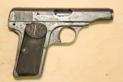Pistolet Browning FN M 1910, kal. 7,65mm. Z prawej strony broni na lufie, w oknie wyrzutnika widoczny nr broni 187472. Numer ten powtórzono na korpusie poniżej, słabo czytelny. Brak niektórych mechanizmów, jednej okładziny rękojeści i magazynka. Liczne ślady po wżerach korozy...więcej Pistolet Browning FN M 1910, kal. 7,65mm. Z prawej strony broni na lufie, w oknie wyrzutnika widoczny nr broni 187472. Numer ten powtórzono na korpusie poniżej, słabo czytelny. Brak niektórych mechanizmów, jednej okładziny rękojeści i magazynka. Liczne ślady po wżerach korozyjnych. |