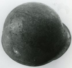 Dzwon polskiego hełmu wojskowego wz. 31 Z fasunku zachowały się tylko niekompletne paski skórzane i nity mocujące. Na całej powierzchni ślady korozji. Zachowały się pozostałości farby. Brak widocznych sygnatur. |