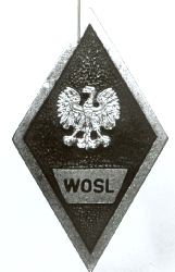 Pamiątkowa odznaka absolwenta Wyższej Oficerskiej Szkoły Lotnictwa. Na środku odznaki srebrny orzeł na czerwonym tle. odznaka obramowana srebrną listwą. Poniżej orła na srebrnej wstędze WOSL. Odznaka w kształcie rombu, na odwrocie trzpień z gwintem oraz nakrętka. |