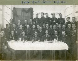 Fotografia czarno-biała. Przedstawia grupę oficerów i podoficerów Oficerskiej Szkoły Artylerii w Toruniu. |