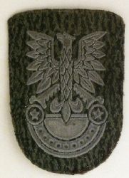 Orzeł na rogatywkę LWP. Nadruk z szarej gumy na plakietce z sukna w kolorach ochronnych. Orzeł bez korony, wsparty na tarczy amazonek o 9 gwoździach. |