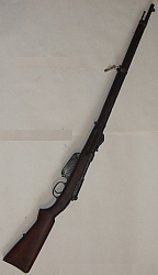 Karabin Mauser kawaleryjski. Łoże drewniane sięgające długością do wylotu lufy, zakończone metalową okuwką. Na elementach metalowych liczne sygnowania: na komorze zamkowej centralnie: Cester WAFFFBGS, z lewej strony: 7336A( dwukrotnie), dalej gotykiem : MOD 71, oraz trzy sła...więcej Karabin Mauser kawaleryjski. Łoże drewniane sięgające długością do wylotu lufy, zakończone metalową okuwką. Na elementach metalowych liczne sygnowania: na komorze zamkowej centralnie: Cester WAFFFBGS, z lewej strony: 7336A( dwukrotnie), dalej gotykiem : MOD 71, oraz trzy słabo czytelne znaczki (fabryczne próby wytrzymałościowe). Ponadto z lewej strony strony broni, na komorze w pobliżu celownika, powtórzony numer 7336A F.W. mechanizmy ruchome. Elementy drewniane zachowane dobrze, na metalowych wżery korozyjne. Pod łożem w miejscu mocowania lufy w łożu ślady flekowania ( przy śrubie). |