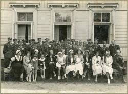 Fotografia czarno biała. Przedstawia grupę oficerów z Oficerskiej Szkoły Artylerii w Toruniu z rodzinami. |
