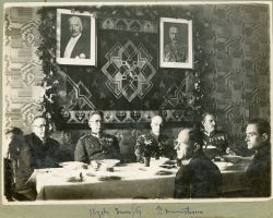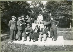 Fotografia czarno-biała przedstawiająca grupę oficerów wraz z członkami rodzin. |