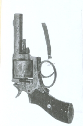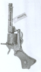 Rewolwer dwutaktowy, 6 strzałowy kalibru 11,5mm. Bezpiecznik dźwigniowy umocowany z lewej strony, u nasady kurka. Sygnowania nieczytelne, nr. broni nieczytelny. Proste nakładki na uchwycie , silnie zniszczone.
