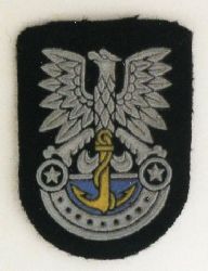 Orzeł Marynarki Wojennej, wykonany z gumy na czarnej podkładce sukiennej. Biały, kotwica żółta, część tarczy amazonek niebieska. |
