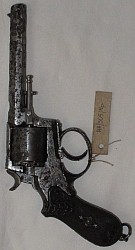 Rewolwer 6 strzałowy kal. 12 mm. Korpus stalowy bez zdobień, silnie skorodowany, pokryty wżerami. Sygnowania i numery broni nieczytelne. Mechanizmy częściowo sprawne. Drewniane nakładki rękojeści radełkowane. Kal. 9mm.