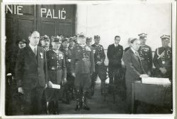 Fotografia czarno-biała. Grupa wyższych oficerów w Oficerskiej Szkole Artylerii w Toruniu. |