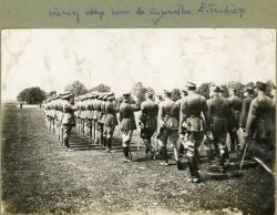 Czarno-biała fotografia przedstawiająca wizytę Marszałka Józefa Piłsudskiego w Oficerskiej Szkole Artylerii w Toruniu. Fotografia błędnie podpisana: Niemcy oddają honor dla marszałka Piłsudskiego. |