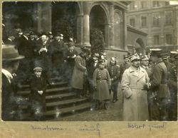 Czarno-biała fotografia przedstawiająca gen. Hallera w otoczeniu wojskowych i cywili przed ratuszem w Poznaniu. Wykonana prawdopodobnie w drugiej połowie 1919r. Poniżej fotografii podpisy ze strzałkami: Ministrowie, Niemcy, Haller generał. |