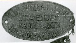 Tabliczka metalowa w kształcie elipsy. Na powierzchni wytłoczone napisy: TOW. PRZEMYSŁOWE "TABOR" 1929. L. 16 KRAKÓW WIELICZKA 2 Liczba 16 dobita na prostokątnym polu, na gotowej już tabliczce. Na krawędziach dwa otwory do mocowania. |