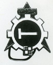 Wpinka emaliowana. Koło zębate z wpisaną leżącą literą T na tle trójkąta. Poniżej szachownica lotnicza, powyżej litery WBSiPL - Wojskowe Biuro Studiów i Projektów Lotniskowych. |