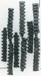 Fragmenty taśm do RKM-u PK. Wykonane ze sprężynującej blachy. Każdy odcinek składa się z łańcucha 10 połączonych obrotowo ogniwek blaszanych. Połączenie zawiasowe ogniwek wykonane jest w postaci śrubowo nawiniętych sprężynek. Ogniwka otwarte, łączone w odcinki 10-cio...więcej Fragmenty taśm do RKM-u PK. Wykonane ze sprężynującej blachy. Każdy odcinek składa się z łańcucha 10 połączonych obrotowo ogniwek blaszanych. Połączenie zawiasowe ogniwek wykonane jest w postaci śrubowo nawiniętych sprężynek. Ogniwka otwarte, łączone w odcinki 10-cio elementowe z charakterystycznym zakończeniem umożliwiającym łączenie odcinków na naboju. Lekkie ślady korozji na powierzchni taśm. |