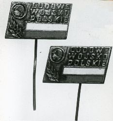 Dwie wpinki z napisem LUDOWE WOJSKO POLSKIE, głową żołnierza w hełmie wpisaną w okrąg, ornamentem roślinnym i emaliowaną flagą polską. Osadzone na szpilkach. |