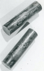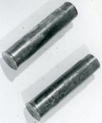 Łuski mosiężne z wystającą kryzą, kal. 26mm. Na dnach łusek wytłoczone symbole: pięcioramienna gwiazda i napis "pocisk" w owalu, obok napisu mniejsza gwiazda. Na długości 1,5cm od góry lekkie zwężenie łuski. |