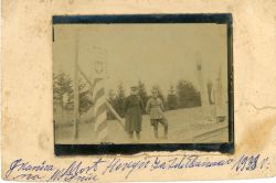 Czarno-biała fotografia przedstawiająca dwu Polaków i rosyjskiego strażnika granicznego przy słupach granicznych i torach kolejowych. Opatrzone nie w pełni czytelnym podpisem: Granica Most Horyń za ****** 1938r na Wołyniu. |