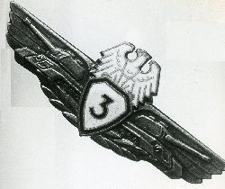 Odznaka mechanika kierowcy. W centralnej części umieszczony orzeł biały siedzący na tarczy z cyfrą 3. Po obu jego stronach sylwetki czołgów na tle skrzydeł, pod nimi ornament roślinny. |