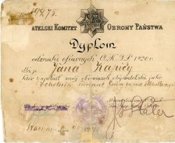 Dyplom Odznaki Ofiarnych Obywatelskiego Komitetu Obrony Państwa, przyznanej Janowi Kapicy (ochotnik, sierżant grupy wypadowej mjr. Marczyńskiego). W lewym, górnym rogu l.p. dyplomu: 19275 Dyplom podpisany przez Przewodniczącego OKOP Gen. Insp. Armii Ochotniczej Józefa Hallera. Po...więcej Dyplom Odznaki Ofiarnych Obywatelskiego Komitetu Obrony Państwa, przyznanej Janowi Kapicy (ochotnik, sierżant grupy wypadowej mjr. Marczyńskiego). W lewym, górnym rogu l.p. dyplomu: 19275 Dyplom podpisany przez Przewodniczącego OKOP Gen. Insp. Armii Ochotniczej Józefa Hallera. Pozostałe podpisy nieczytelne, podobnie datowanie: Warszawa dnia 2(7?)... 1921r. Pośrodku okrągła, słabo czytelna pieczątka: Obywatelski Komitet Obrony Państwa. |
