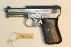 Pistolet Mauser kal. 7,65 . Na zamku, z lewej strony wybity napis: Waffenfabrik Mauser A.-G. Oberndorf A.N R'S Patent. NA pokrywie bocznej logo MAUSER.