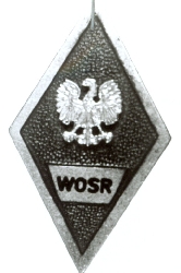 Pamiątkowa odznaka absolwenta Wyższej Oficerskiej Szkoły Radiolokacji. Na środku odznaki srebrny orzeł na czerwonym tle. Odznaka obramowana srebrną listwą. Poniżej orła na srebrnej wstędze WOSR. Odznaka w kształcie rombu, na odwrocie trzpień z gwintem oraz nakrętka. |