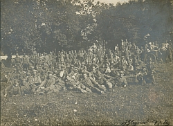 Fotografia w tonacji-czarno białej przedstawiająca grupę żołnierzy polskich pozujących do zdjęcia. W prawym rogu widoczna kuchnia polowa. W prawym, dolnym rogu napis: J. Głogowski 5 p.p.Leg. Na odwrocie odręczna adnotacja, długopisem: "5 p.p. Leg - I wojna św". Fotografia po...więcej Fotografia w tonacji-czarno białej przedstawiająca grupę żołnierzy polskich pozujących do zdjęcia. W prawym rogu widoczna kuchnia polowa. W prawym, dolnym rogu napis: J. Głogowski 5 p.p.Leg. Na odwrocie odręczna adnotacja, długopisem: "5 p.p. Leg - I wojna św". Fotografia podklejona na tekturze. |
