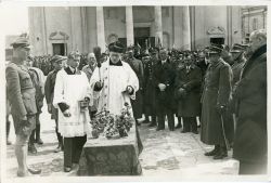 Czarno-biała fotografia przedstawiająca poświęcenie broni przed Bazyliką N. M. Panny w Chełmie. Na odwrocie opatrzona odręcznym komentarzem: