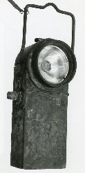 Latarka akumulatorowa wykonana z blachy stalowej. Na 2/3 wysokości odłączany pojemnik na baterie. W górnej części zamocowany druciany uchwyt do przenoszenia. Z tyłu wytłoczony nr 195/54 |