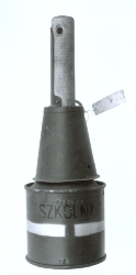 Granat F-1 z zapalnikiem szkolnym. Korpus żeliwny ze śladem białej farby. Na dnie tłoczenie : 60 SZK.