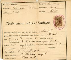Świadectwo chrztu Alfonsa Alojzego, syna Jakuba i Heleny Cyrulików. Wystawione w parafii w Łańcucie 09.06.1928r. Posiada znaczek opłaty skarbowej i pieczęć parafii w Łańcucie. |