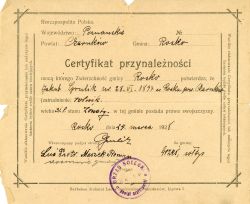 Certyfikat poświadczający prawo własności Jakuba Cyrulika na terenie gminy Rosko w woj. poznańskim. Wystawiony 24.03.1928r. Dokument opatrzony pieczęcią gminy i podpisami świadków. |