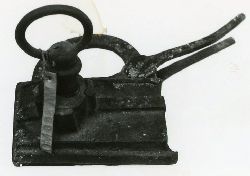 Kłódka wykonana z kutej stali. Prawdopodobnie wyrób rzemieślniczy. Uszkodzony uchwyt na łańcuch i ślady korozji. |
