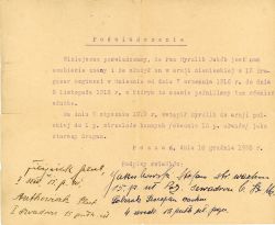 Poświadczenie służby Jakuba Cyrulika w armii niemieckiej podczas I wojny światowej. Służył od 07.09.1916 do 08.11.1918 w 12 regimencie Dragonów w Gnieźnie. 07.01.1919 wstąpił do armii polskiej, do 15 Pułku Ułanów. Pismo zostało opatrzone odręcznymi podpisami świadków....więcej Poświadczenie służby Jakuba Cyrulika w armii niemieckiej podczas I wojny światowej. Służył od 07.09.1916 do 08.11.1918 w 12 regimencie Dragonów w Gnieźnie. 07.01.1919 wstąpił do armii polskiej, do 15 Pułku Ułanów. Pismo zostało opatrzone odręcznymi podpisami świadków. |