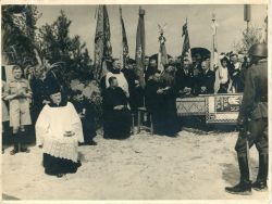 Czarno-biała fotografia okazująca poczty sztandarowe, wojskowych i duchownych podczas uroczystości poświęcenia sztandaru POW w Chełmie Lubelskim 10 marca 1938r. Na odwrocie odręczna adnotacja: 10 III 1938 Msza polowa i poświęcenie sztandaru POW. od lewej ks. kanonik Jakubiec(...więcej Czarno-biała fotografia okazująca poczty sztandarowe, wojskowych i duchownych podczas uroczystości poświęcenia sztandaru POW w Chełmie Lubelskim 10 marca 1938r. Na odwrocie odręczna adnotacja: 10 III 1938 Msza polowa i poświęcenie sztandaru POW. od lewej ks. kanonik Jakubiec(?) (proboszcz "górki katedralnej"), dalej inskrypcja nieczytelna, od prawej d-ca kompanii honorowej i pocztu sztandarowego 7 p. p. Leg. por. Lipiński. Pośrodku rewersu czerwona pieczęć: Reprodukcja prawnie zastrzeżona. "Foto Kupś" Chełm ul. Lubelska 55. W późniejszym czasie dopisano jeszcze 5 w owalu. |