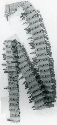 Taśma parciana z 37 nabojami. Pochodzi z CKM Mg 08, MG 08/15 lub wz. 1910/28. Spinana przegrodami mosiężnymi, co trzecia przedłużona. Na spłonkach nabojów zielone obwódki i wybite symbole: polski orzeł 33 N 67. Mosiężne przegrody pokryte patyną, taśma parciana w złym stan...więcej Taśma parciana z 37 nabojami. Pochodzi z CKM Mg 08, MG 08/15 lub wz. 1910/28. Spinana przegrodami mosiężnymi, co trzecia przedłużona. Na spłonkach nabojów zielone obwódki i wybite symbole: polski orzeł 33 N 67. Mosiężne przegrody pokryte patyną, taśma parciana w złym stanie, ubytki materiału. |