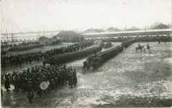 Czarno-biała fotografia przedstawiająca oddziały wojska i orkiestrę wojskową na placu koszarowym. Na odwrocie odręczne adnotacje: Chełm Lub. 38r i 7 p. p. Leg. w Lubomlu (wręczenie ciężkich karabinów maszynowych). |