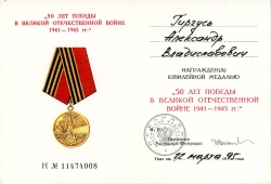 Legitymacja medalu 50 lecia zwycięstwa w Wielkiej Wojnie Ojczyźnianej |