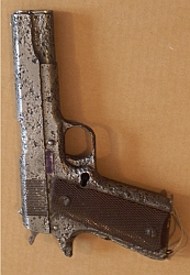 Pistolet Colt M1911 A1, samopowtarzalny, kal. 11,43mm, 7 strzałowy. Powierzchnie stalowe zniszczone przez wżery korozji. Okładziny rękojeści bakelitowe, lewa uszkodzona. Na zamku częściowo czytelne sygnatury, z lewej strony: REMINGTON RAND IN* SYRACUSE NY U.S.A. Z prawej strony:...więcej Pistolet Colt M1911 A1, samopowtarzalny, kal. 11,43mm, 7 strzałowy. Powierzchnie stalowe zniszczone przez wżery korozji. Okładziny rękojeści bakelitowe, lewa uszkodzona. Na zamku częściowo czytelne sygnatury, z lewej strony: REMINGTON RAND IN* SYRACUSE NY U.S.A. Z prawej strony: M1911 **** ARMY |