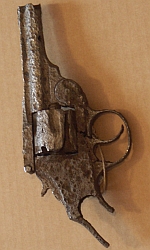 Destrukt rewolweru Smith and Wesson lub na nim wzorowanego. 5 strzałowy, kal. prawdopodobnie 7,65mm. Znaczne wżery pokorozyjne, brak rękojeści i okładzin. Mechanizmy niesprawne.