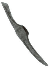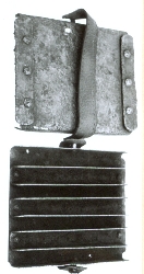 Podwójne zgrzebło. Brak czytelnych napisów, obie części połączone skórzanym paskiem. Zgrzebło poddane konserwacji, głębokie wżery na całej powierzchni.