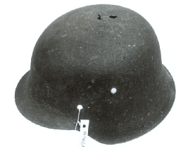 Hełm niemiecki wz.42. Wykonany z blachy stalowej, tłoczony. Wyraźnie zaznaczony daszek, nakarczek i nauszniki. Obrzeża obcinane, nie podwijane. Na wysokości skroni dwa otwory wentylacyjne, otwory mocujące stalową obręcz wewnątrz hełmu umieszczone powyżej, przesunięte do ty...więcej Hełm niemiecki wz.42. Wykonany z blachy stalowej, tłoczony. Wyraźnie zaznaczony daszek, nakarczek i nauszniki. Obrzeża obcinane, nie podwijane. Na wysokości skroni dwa otwory wentylacyjne, otwory mocujące stalową obręcz wewnątrz hełmu umieszczone powyżej, przesunięte do tyłu. Z tyłu taki sam otwór umieszczony centralnie. Na szczycie hełmu ubytki blachy spowodowane korozją. Brak obręczy stalowej wewnątrz hełmu i podpinki. Brak symboli. |