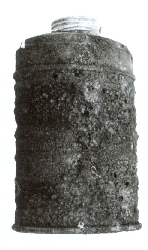Pochłaniacz maski p.gaz W.S.R. wz 32. Bardzo skorodowany, duże ubytki blachy. rak czytelnych symboli i sygnowań. |