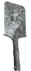 Łopatka piechoty, prostokątna, bez trzonka. Metalowy uchwyt służący do przymocowania trzonka spięty pierścieniem . Osada trzonka przymocowana do sztychu za pomocą pięciu nitów. Górne krawędzie sztychu wygięte do tyłu. Brak symboli i sygnatur, powierzchnia skorodowana z g...więcej Łopatka piechoty, prostokątna, bez trzonka. Metalowy uchwyt służący do przymocowania trzonka spięty pierścieniem . Osada trzonka przymocowana do sztychu za pomocą pięciu nitów. Górne krawędzie sztychu wygięte do tyłu. Brak symboli i sygnatur, powierzchnia skorodowana z głębokimi wżerami. |