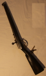 Karabinek kawaleryjski Dreyse M-1854, odtylcowy, iglicowy. Jednostrzałowy. Lufa kal. 16mm, gwintowana na całej długości, oprawiona w drewno, zakończona metalową okuwką z muszką. Okuwka mocowana do lufy śrubą. Spust i jego mocowanie stalowe, osłona spustu mosiężna. Kolba z ...więcej Karabinek kawaleryjski Dreyse M-1854, odtylcowy, iglicowy. Jednostrzałowy. Lufa kal. 16mm, gwintowana na całej długości, oprawiona w drewno, zakończona metalową okuwką z muszką. Okuwka mocowana do lufy śrubą. Spust i jego mocowanie stalowe, osłona spustu mosiężna. Kolba z policzkiem zakończona mosiężną stopką, mocowaną śrubami. Zamek i spust ruchome. Na częściach stalowych głębokie wżery korozyjne. Drewno ciemne, lakierowane, z licznymi śladami płytkich, poprzecznych pęknięć pod lufą. Brak sygnowań. |