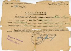 ZaÅ›wiadczenie nr 555/5/0g./45 wydane przez starostwo powiatowe w ZamoÅ›ciu, datowane 13.I.1945 r. PoÅ›wiadczajÄ…cy tożsamość osoby wydane celem przedÅ‚ożenia w punkcie wymiany banknotów banku emisyjnego w ZamoÅ›ciu. Pismo odrÄ™czne i druk maszynowy opatrzone okrÄ…głą pieczÄ™ciÄ...wiÄ™cej ZaÅ›wiadczenie nr 555/5/0g./45 wydane przez starostwo powiatowe w ZamoÅ›ciu, datowane 13.I.1945 r. PoÅ›wiadczajÄ…cy tożsamość osoby wydane celem przedÅ‚ożenia w punkcie wymiany banknotów banku emisyjnego w ZamoÅ›ciu. Pismo odrÄ™czne i druk maszynowy opatrzone okrÄ…głą pieczÄ™ciÄ… "Starostwo Powiatowe w ZamoÅ›ciu" i podpisem ( nieczytelnym). W lewym dolnym rogu pieczęć o treÅ›ci: wymiany dokonano, odbita dwukrotnie. Na odwrocie niemiecki nadruk: OrzeÅ‚ niemiecki, swastyka i napis:"Generalgouvernement Distrikt Lublin der Kreishauptamnn in Zamosc, Den" |