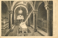 Pocztówka w kolorach szarych przedstawiająca "trumnę Marsz . J. Piłsudskiego w Grobach Królewskich w Krakowie" wg. rys. Br. Rychter-Janowskiej. |