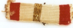 Baretka Krzyża Walecznych z jedną belką oznaczająca podwójne odznaczenie. Bartka w kolorze białym z dwoma czerwonymi pasami po bokach. Na środku mosiężna listewka, ornamentowana liśćmi dębu. |