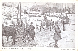 Pocztówka w kolorze szaro białym przedstawiająca rysunek St. Janowskiego. Na pocztówce widnieją żołnierze Legionów Polskich podczas bitwy w Rafajłowej. Na odwrotnej stronie napis: Nakładem Naczelnego Komitetu Narodowego na cele Legionów Serya IV Józef Ryszkiewicz Stanisław...więcej Pocztówka w kolorze szaro białym przedstawiająca rysunek St. Janowskiego. Na pocztówce widnieją żołnierze Legionów Polskich podczas bitwy w Rafajłowej. Na odwrotnej stronie napis: Nakładem Naczelnego Komitetu Narodowego na cele Legionów Serya IV Józef Ryszkiewicz Stanisław Janowski. |